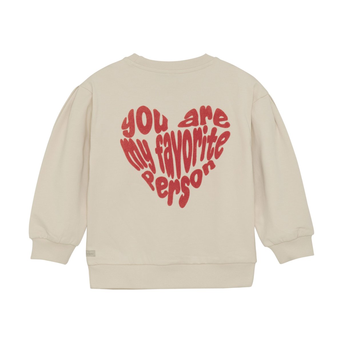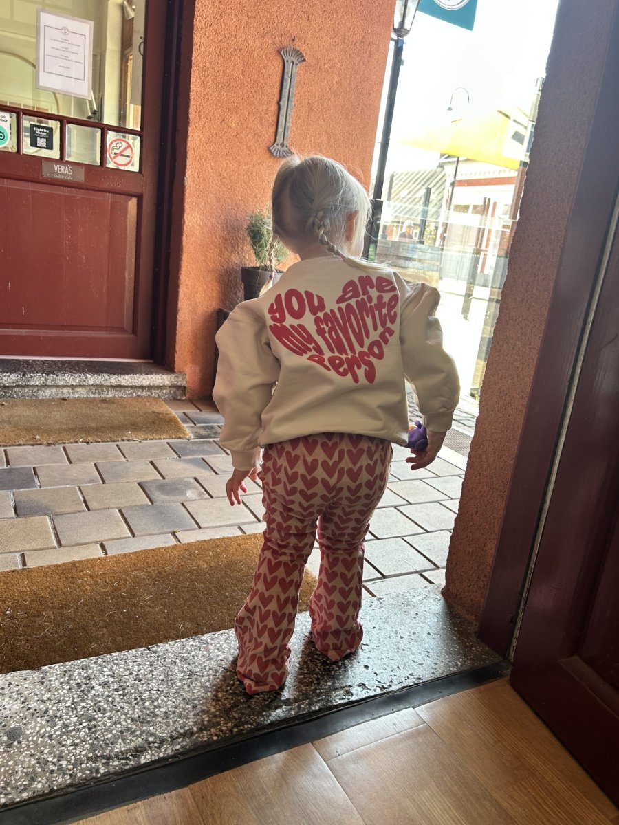 Beige tröja med rött lurvigt hjärtformat print på ryggen ”you are my favorite person” och litet hjärtformat print på vänster sida fram med samma text.