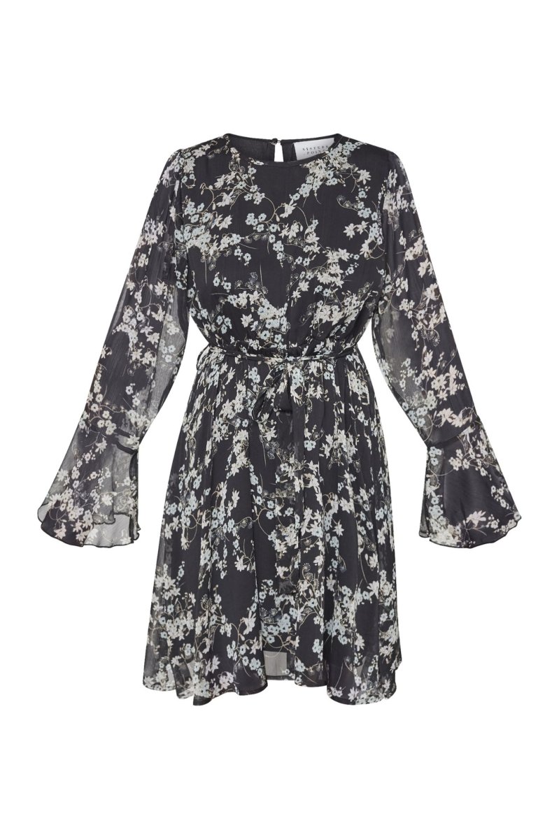 En knälång klänning med ett mönster av små blommor. Klänningen har långa ärmar som är transparenta och avslutas med en volangkant.