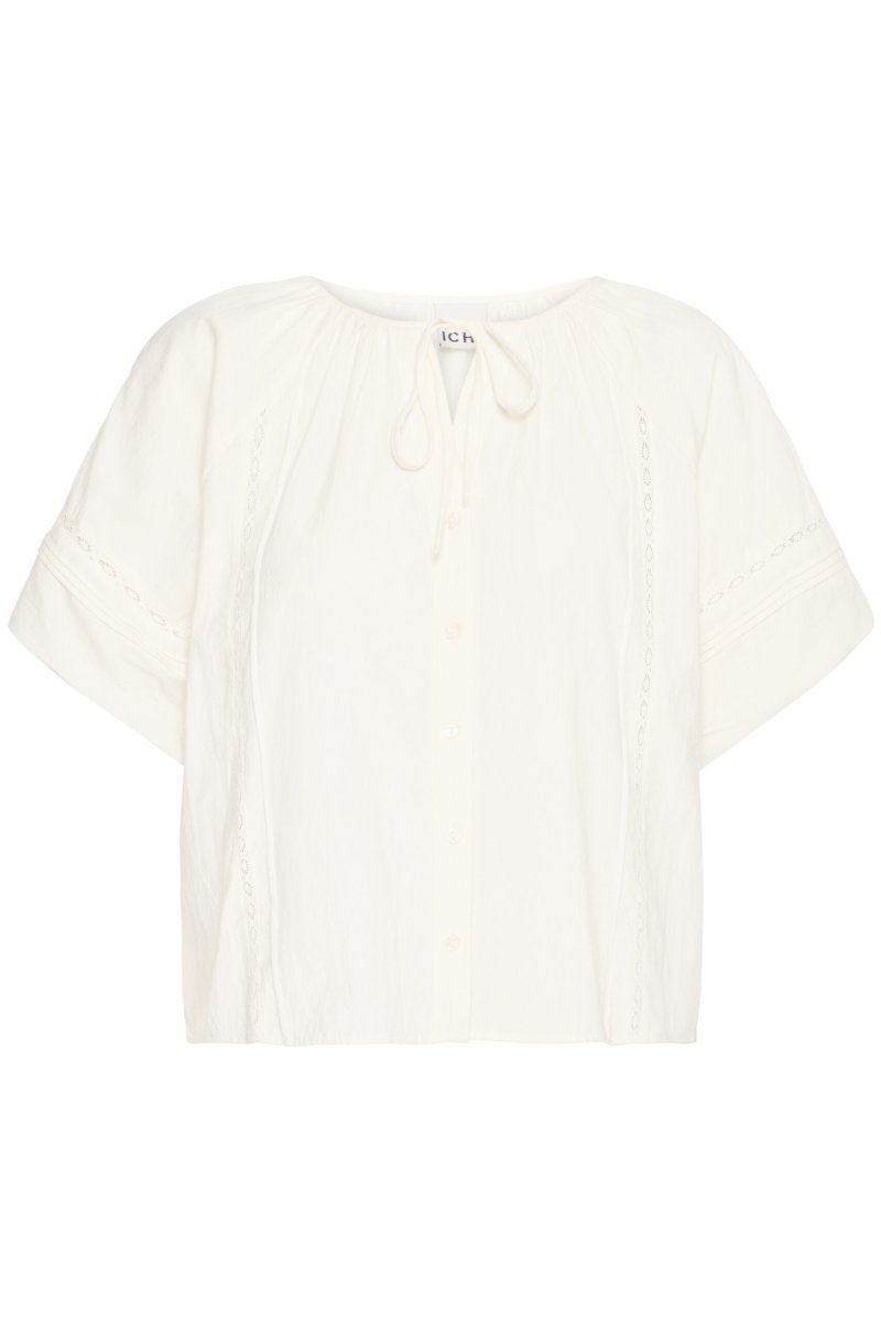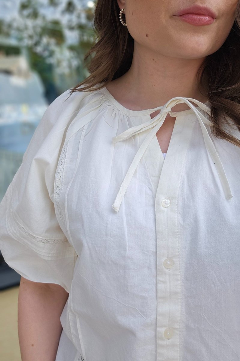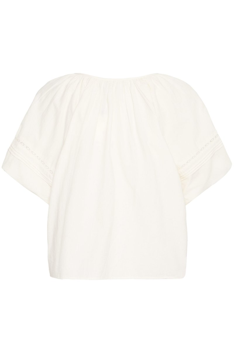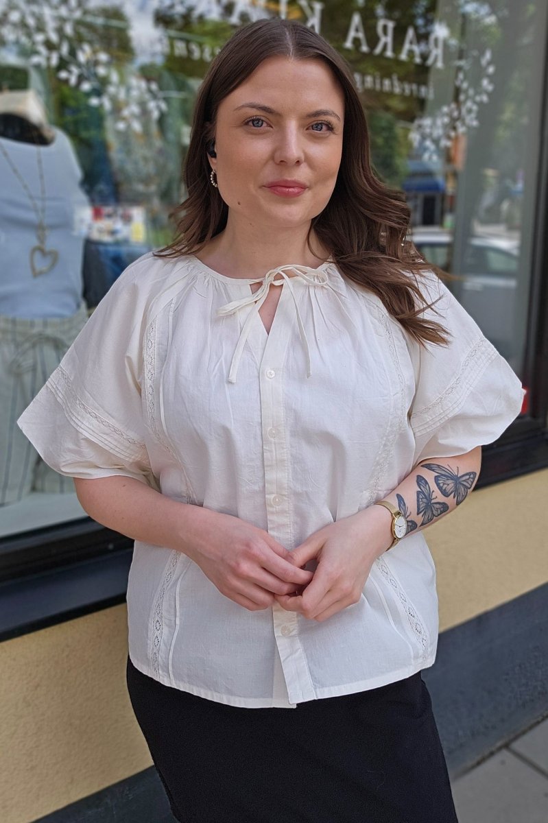 Vid blus med smala spetsinfällningar och korta ballongärmar.