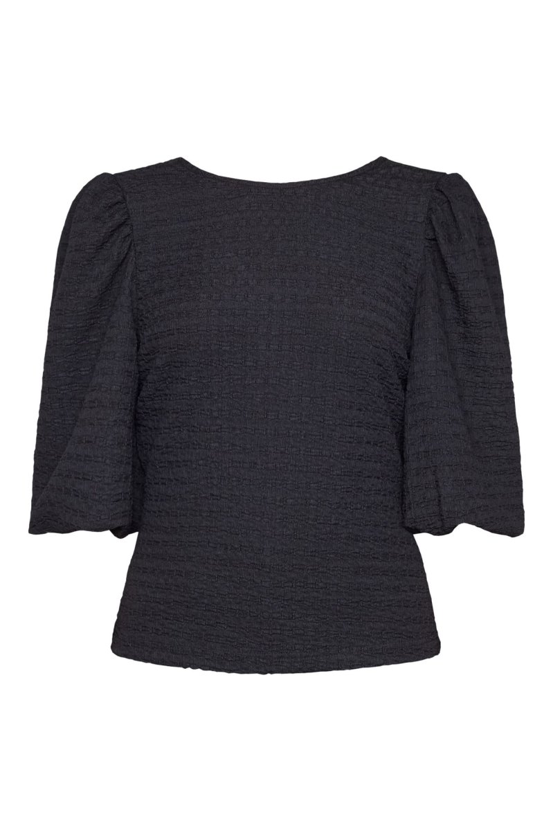En figurnära blus med strukturerad, rutig yta och korta puffärmar som når armbågarna.