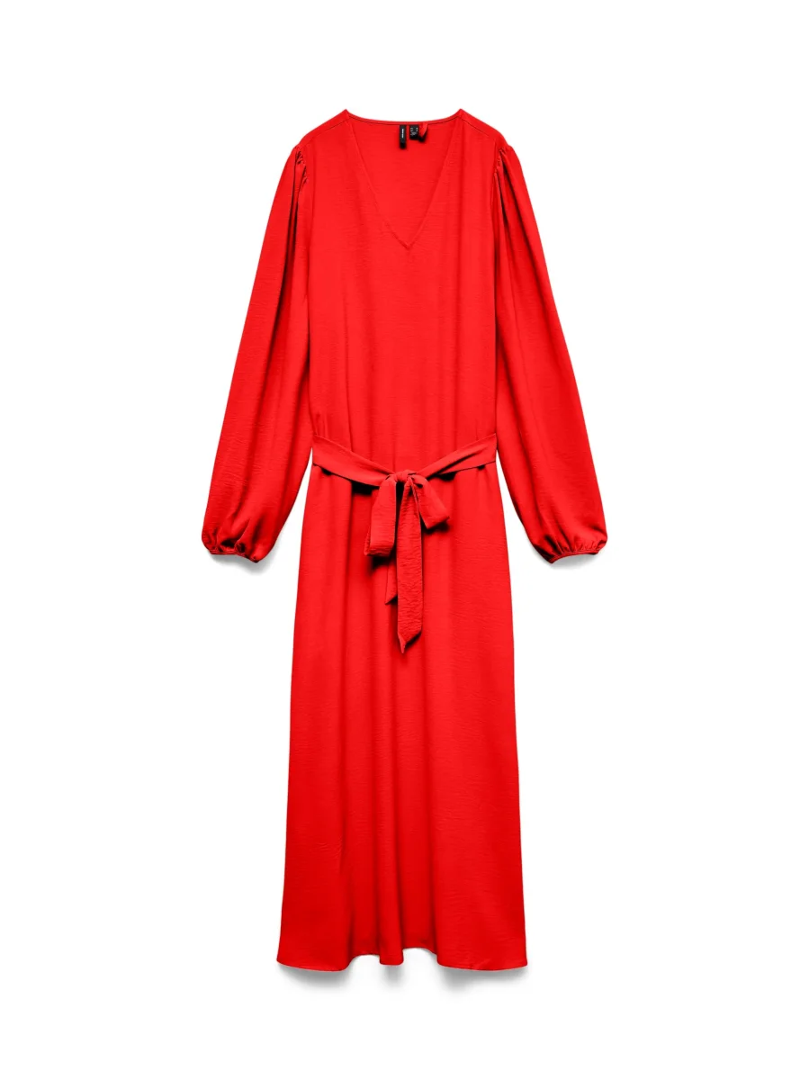 Lång klänning med lång ärm. Fickor och slits i sidorna. Bälte till midjan medföljer. Färg: Fiery red Material: 100% Återvunnen Polyester