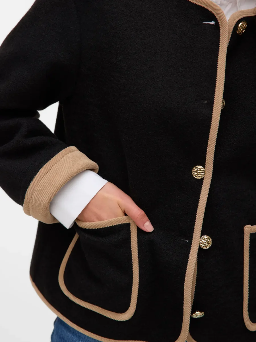 Kort jacka i ull-liknande material. Utanpåliggande fickor, uppvik i ärmslutet och fina guldiga knappar.